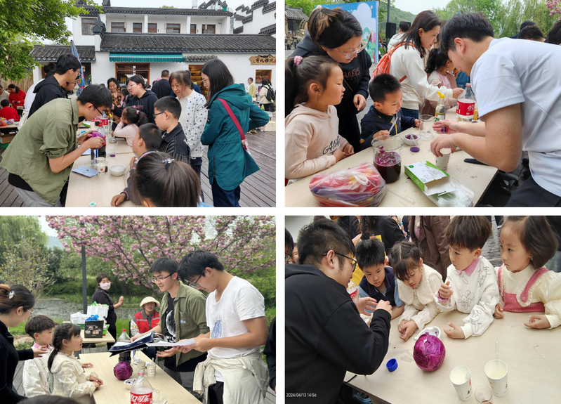 蒋雯若爱心社的志愿者向小朋友们介绍了紫甘蓝和花青素的基本知识,让小朋友们对这种神奇的蔬菜有了初步的了解。随后,志愿者指导小朋友们自己动手,从紫甘蓝中提取花青素制备简易酸碱指示剂。小朋友们看着紫甘蓝提取液在酸性环境下变红,在碱性环境下变绿,惊叹不已。