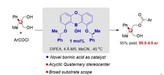 近日,公司郑文华课题组开发了首例新型C2对称手性硼酸催化剂并应用了在2,2-二取代-1,3-二醇的去对称化中。该课题组以10H-dibenzo[b,e][1,4]oxaborinin-10-ol骨架为基础,在硼酸两侧引入“手性臂”,设计了首例C2对称的手性硼酸催化剂,并以简洁的步骤合成了目标催化剂并通过单晶衍射进一步明晰了催化剂的空间立体结构。