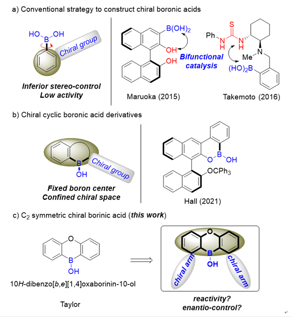 硼酸在有机化学或者药物化学中是一个类重要的结构,也具有重要的用途,比如著名的Suzuki-Miyaura偶联反应中就是使用芳基或者烯基硼酸作为“金属试剂”使用。此外,硼酸在药物化学中也有重要的应用,比如它们是抑制蛋白水解酶的“弹头”,像抗癌药物bortezomib等。同时由于有机硼酸与酸性官能团(如羟基和羧基)存在可逆的共价相互作用,这一特性一直被视作有机硼酸在分子识别应用中的基础,也被当作催化剂用来实现独特的催化剂-底物络合的催化模式。相比之下,由于缺乏高效的手性硼酸,手性硼酸催化不对称性反应的研究一直处于滞后状态,并且仍然是一项具有挑战性的任务。尽管在过去的几十年里化学家们已经做出了相当大的努力,但手性硼酸催化剂的发展依然是一个挑战。