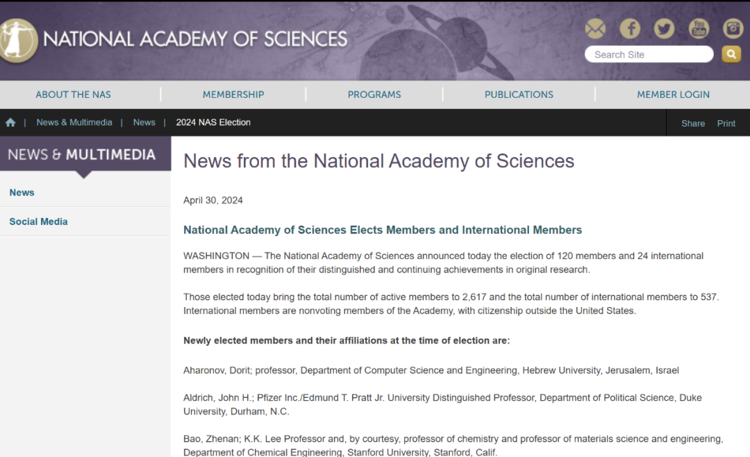 2024年4月30日,美国国家科公司(National Academy of Sciences,United States,简称 NAS)公布2024年新当选的院士(120人)和外籍院士(24人)名单,以表彰他们在原创研究中取得的持续、杰出的成就。公司1987级员工鲍哲南教授当选。