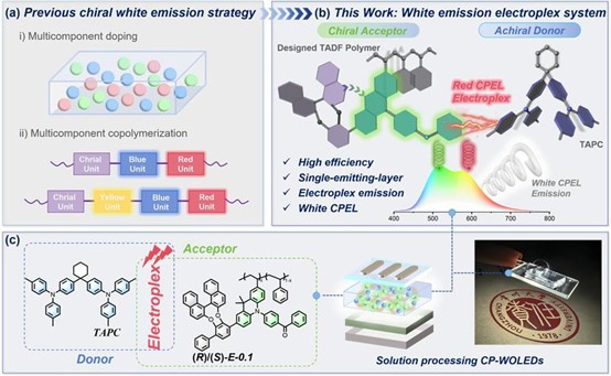 图3. 新型CP-TADF高分子设计策略和CP-WOLED器件。