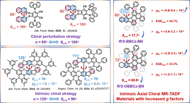 手性多重共振热激活延迟荧光(CP-MR-TADF)材料由于其可以兼具高色纯度、高发光效率和圆偏振发光(CPL)等性质特点,在制备圆偏振有机电致发光器件(CP-OLED)以实现3D和广色域显示中展现出巨大的前景。然而,该领域仍面临诸多挑战,其中最突出的是如何提高材料的不对称因子(g)。其计算公式为g = 4×|μm|×|μe|×cosθe,m/(|μm|2+|μe|2) (μm、μe和θ分别表示磁偶极跃迁矩、电偶极跃迁矩及二者之间的夹角)。因此,为了实现较高的g值,需要考虑三者的调控。