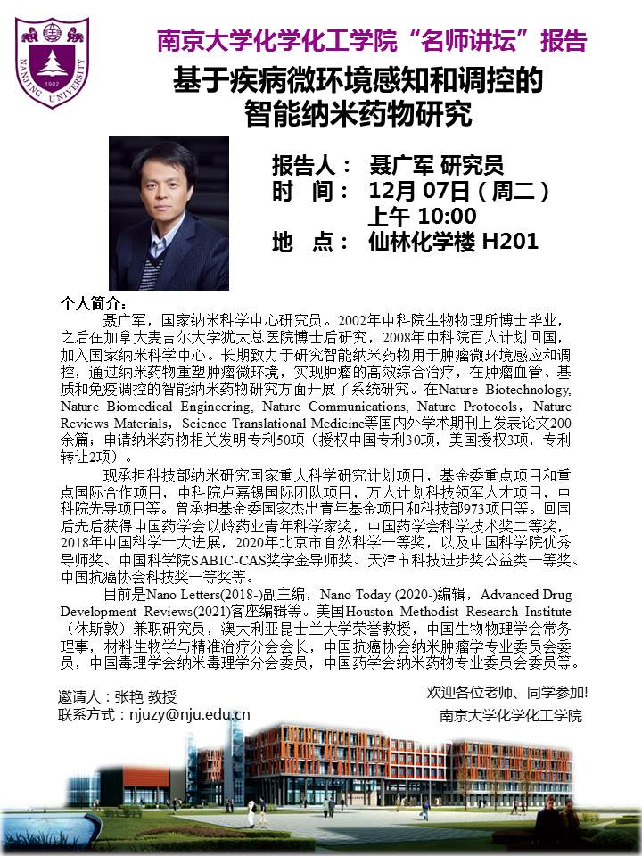 12月7日名师讲坛-聂广军 研究员:基于疾病微环境感知和调控的智能纳米药物研究