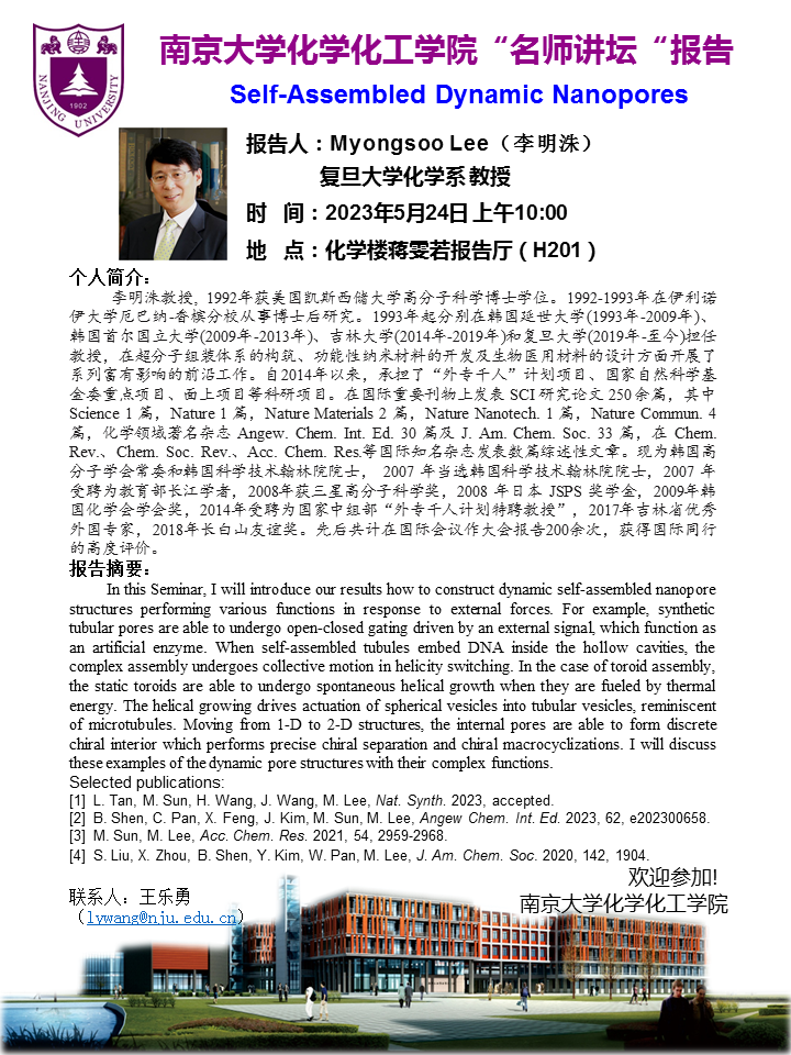 5月24日名师讲坛-李明洙教授:Self-Assembled Dynamic Nanopores