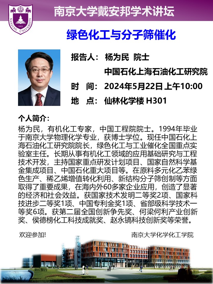 5月22日戴安邦学术讲坛-杨为民院士:绿色化工与分子筛催化