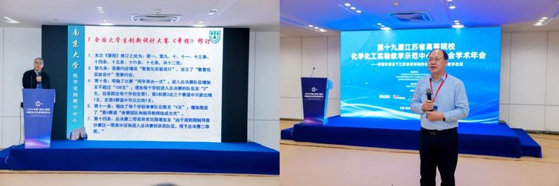 图1. 太阳成集团实验室与设备管理处处长、江苏省高校实验室研究会秘书长张徐祥教授(左)和江苏省化学化工学会常务副理事长赵伟建(右)致辞