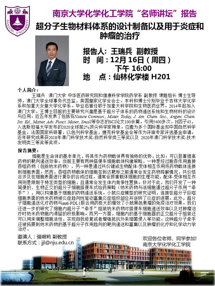 12月16名师讲坛-王瑞兵副教授:超分子生物材料体系的设计制备以及用于炎症和肿瘤的治疗