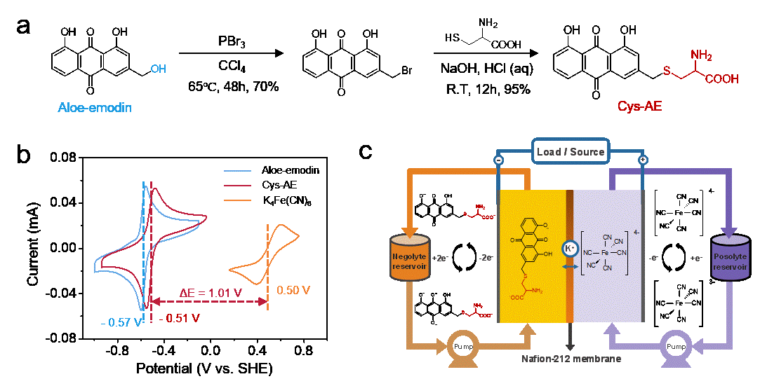 图1. Cys-AE 的合成路径与 Cys-AE | | K₄Fe(CN)₆水系有机液流电池的示意图。
