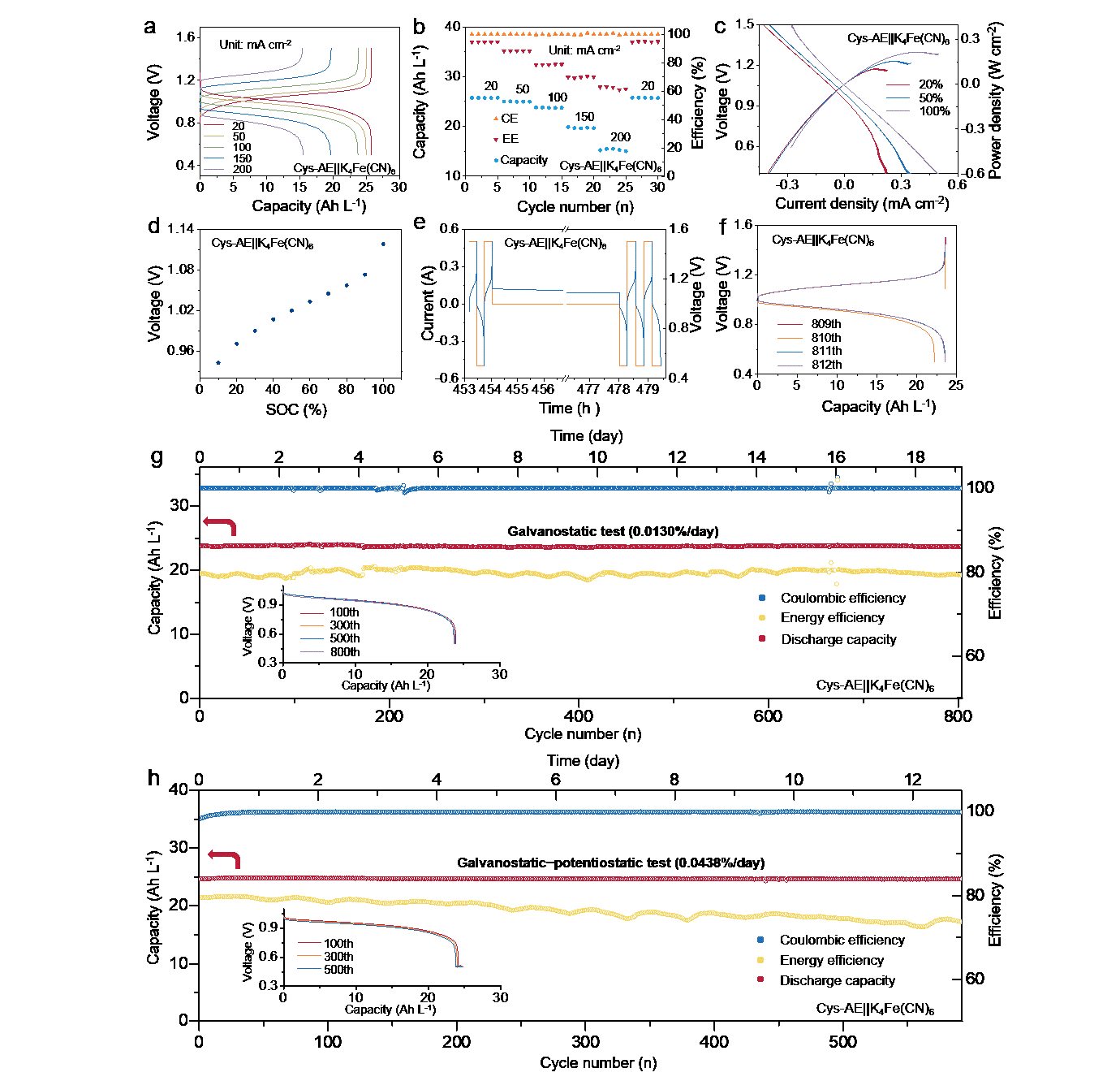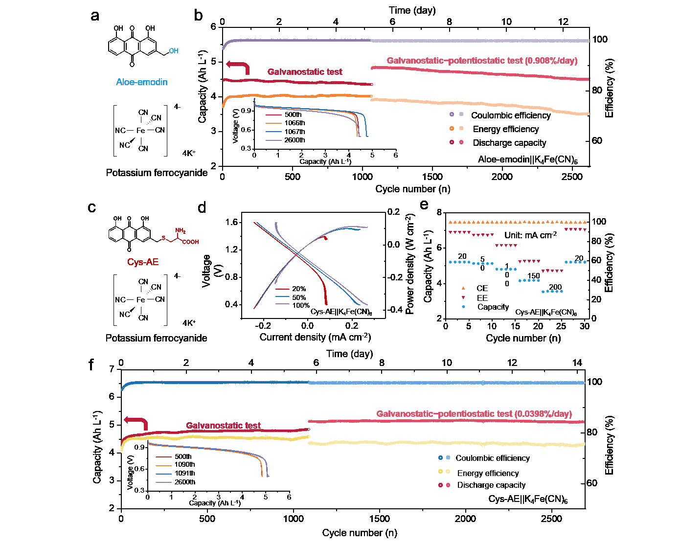 图3. 低浓度条件下AE‖K₄Fe(CN)₆与 Cys-AE‖K₄Fe(CN)₆水系有机液流电池的性能对比。