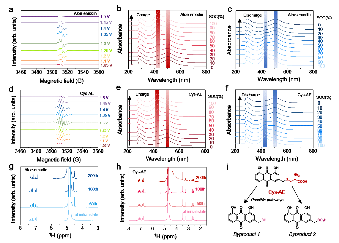随后,研究团队研究了Cys-AE在水溶液中的解离行为,并结合DFT理论计算研究了Cys-AE的氧化还原行为。与天然氨基酸类似,Cys-AE 分子可通过两性解离平衡显著增强其水溶性。此外,通过与溶剂和对离子之间的竞争性相互作用,这些溶解性基团在蒽醌主骨上的不对称分布进一步提升了其最大溶解度。进一步研究发现,Cys-AE 通过 Nafion-212 膜的渗透率低于 1 × 10⁻¹³ cm²/s,能够有效避免电解液穿膜污染。为深入理解 Cys-AE 的分子结构与性能之间的关系,研究人员结合紫外可见光谱(UV-Vis)、核磁共振(NMR)、电子顺磁共振(EPR)等多种手段分析了其电子结构和稳定性。TDDFT 计算结果显示,Cys-AE 分子中的电子云密度主要分布在蒽醌主骨上,而引入的半胱氨酸侧链提升了溶剂化能力和空间阻碍作用,有效抑制分子间聚集及穿膜扩散。