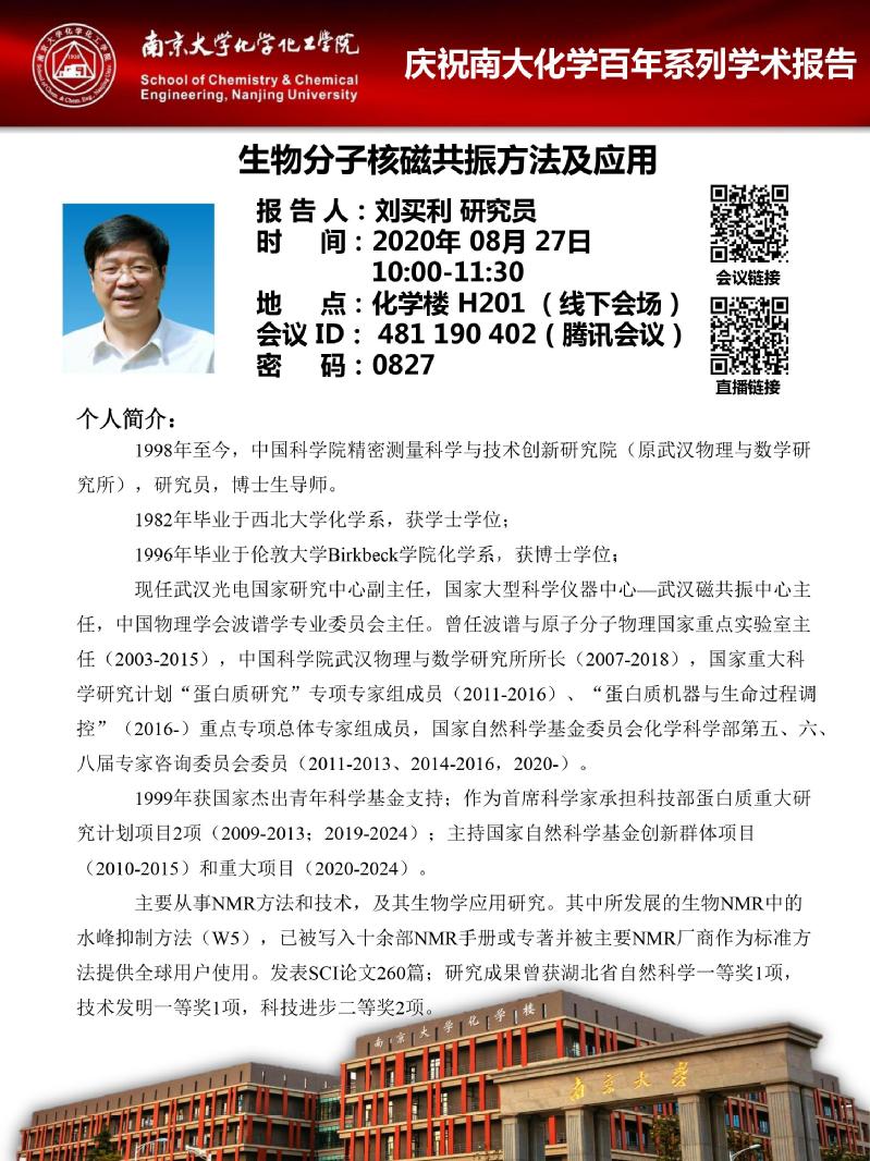 8月27日庆祝南大化学百年系列学术报告-刘买利研究员:生物分子核磁共振方法及应用