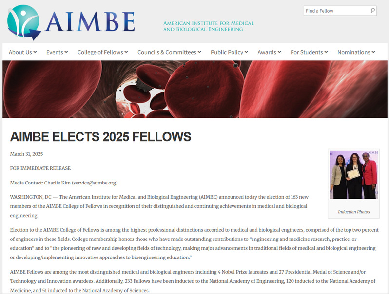 美国医学与生物工程院(AIMBE)是国际医学与生物工程领域著名的非营利学术组织,旨在为医学和生物工程领域的发展提供支持和帮助,以推动社会发展。AIMBE现有2000余位会士,由世界医学与生物工程领域最杰出(Top 2%)的学者组成,代表了最具创新和特色的医学与生物工程领域的学者和工程师。AIMBE会士每年经过国际同行提名与严格评选产生,是美国医学和生物工程技术领域的最高学术荣誉。