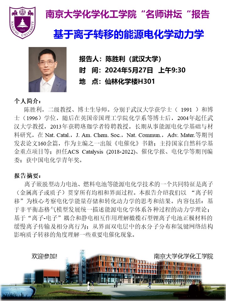 5月27日名师讲坛-陈胜利教授:基于离子转移的能源电化学动力学