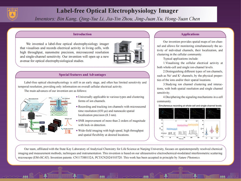 项目简介:本项目发明了一台免标记光学电生理成像仪,可视化和记录活细胞中的电活动。该发明不仅具备微秒级时间分辨率和纳米级空间定位精度,而且通过将干涉原理和锁相检测相结合,实现了单个离子通道检测灵敏度,可应用于神经科学等领域的研究。