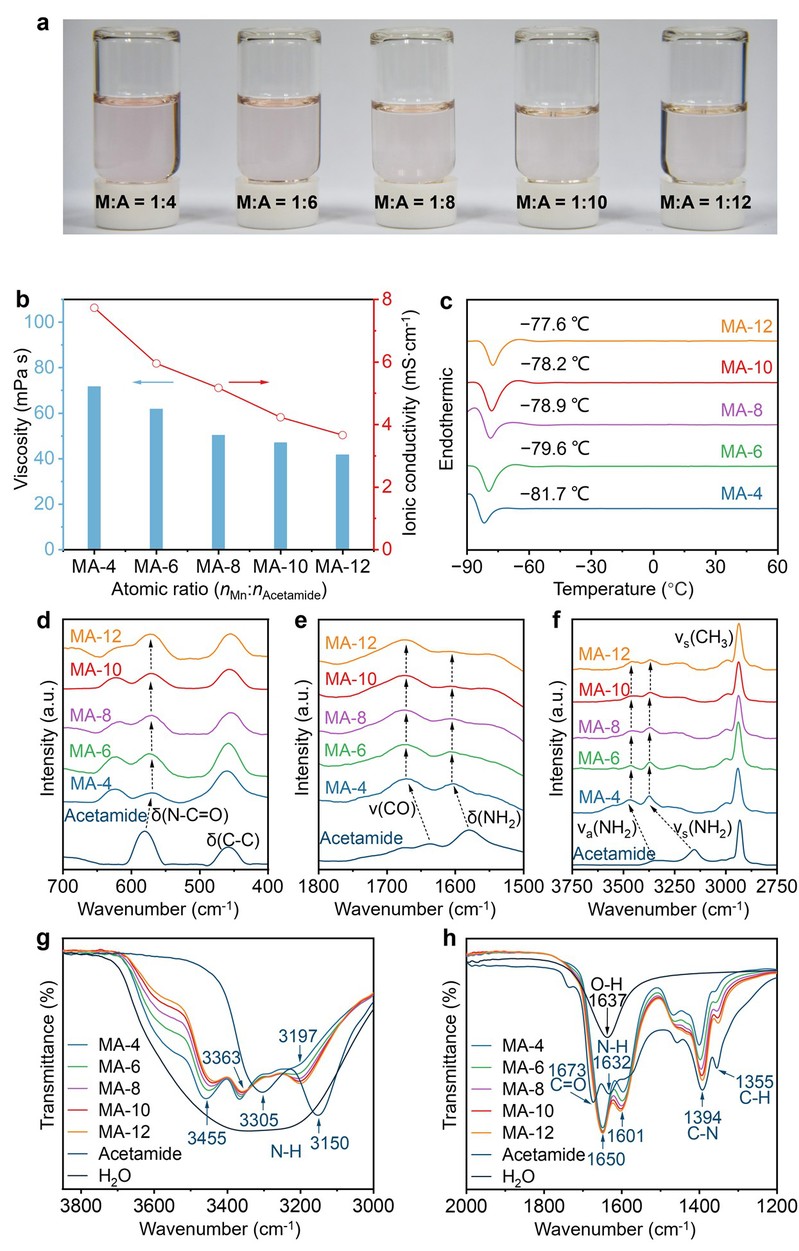 研究团队通过调控Mn(ClO4)2·6H2O与乙酰胺之间的摩尔比,成功制备了一系列水合共晶电解液,并测试其物理性能。结果表明,该类电解液表现出较高的离子传导能力和较低的黏度,为电池的快速离子迁移和稳定运行提供了有利条件。进一步通过Raman和傅里叶变换红外光谱FTIR对电解液中分子间相互作用进行表征,揭示了乙酰胺分子与水分子之间的氢键作用行为。谱图分析表明,乙酰胺的引入调控了水分子之间原有的氢键网络,为构建高稳定性和高性能的水系电解液体系提供了分子层面的理论依据。