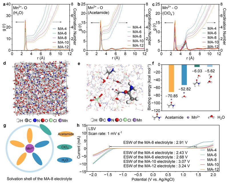 分子动力学(MD)模拟结果表示,随着共晶电解液中乙酰胺比例的上升,Mn2+的溶剂化结构中的水分子逐渐被乙酰胺分子替代。结合能计算进一步验证了乙酰胺与水分子相比具有配位优势,两者之间存在竞争配位。线性伏安扫描(LSV)测试结果表明该水合共晶电解液具有较宽的电化学稳定窗口,有效抑制了析氢反应与析氧反应的发生,为水系锰离子电池的稳定运行提供了保障。