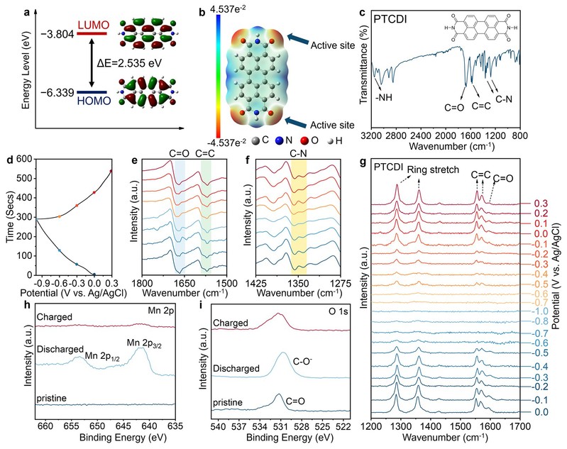 DTF计算结果表明,PTCDI 分子中的羰基为主要反应活性位点,能够与 Mn2+发生有效配位,从而实现其储存行为。为深入揭示PTCDI负极中Mn2+的储存机制,研究团队开展了系统的光谱表征分析。非原位FTIR和原位Raman光谱测试表明,在充放电过程中,PTCDI分子中的羰基发生可逆的烯醇化氧化还原反应,从而实现 Mn2+的存储。通过非原位XPS分析,证实了在-1 V放电状态下 PTCDI负极中Mn2+的存在,同时表明该过程具有良好的结构可逆性。这些结果共同揭示了PTCDI作为水系锰离子电池负极材料的反应机制与电化学稳定性。