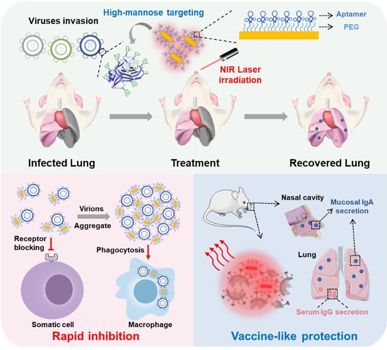 图1 靶向高甘露糖的超高价光热纳米药物对病毒的广谱急性抑制和类疫苗保护的示意图