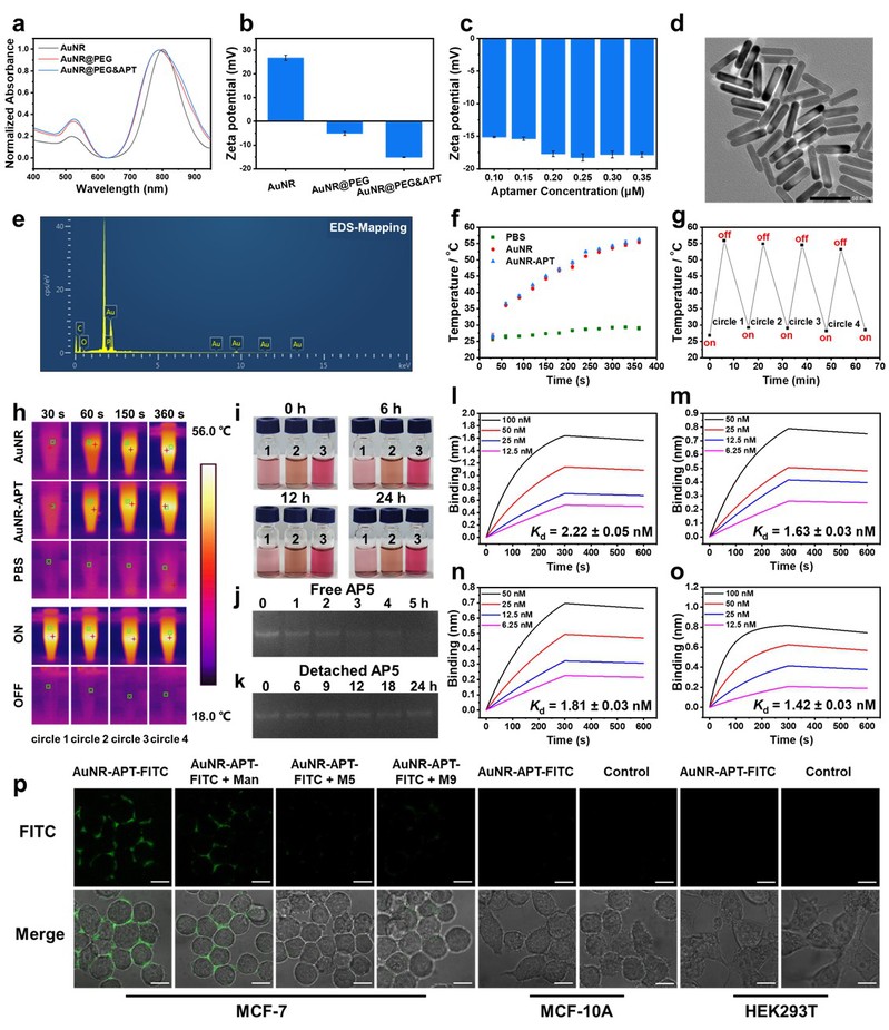 图二、AuNR-APT的合成、光热性质、稳定性和结合亲和力表征