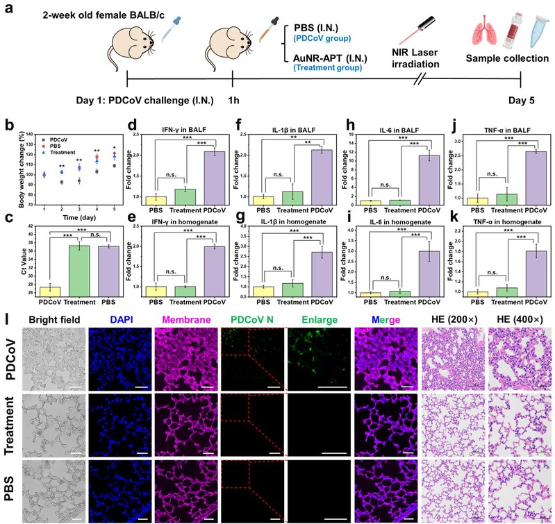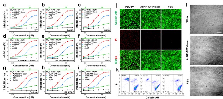 接着,研究人员在细胞层面证明了AuNR-APT具有多重抗病毒机制,包括:阻断病毒与宿主细胞的黏附、诱导病毒粒子聚集、增强巨噬细胞的吞噬作用、促进病毒粒子裂解等(图三)。在多重抗病毒机理的加持下,AuNR-APT有效抑制了包括SARS-CoV-2及其主要变异株、LASV和PDCoV对宿主细胞的侵染(图四)。