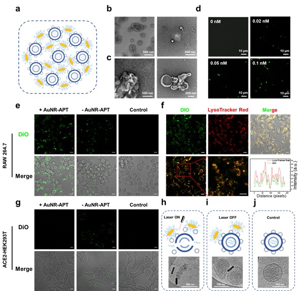 首先,研究人员合成了具有优异光热性能的金纳米棒,并在表面修饰上了具有高甘露糖靶向结合能力的核酸适配体(AuNR-APT),从而有效结合病毒糖盾,实现广谱病毒抑制。所制备的AuNR-APT具有良好的单分散性,元素mapping表征显示金纳米棒表面成功修饰上了适配体与聚乙二醇。此外,表征实验证明AuNR-APT具有优异的光热稳定性和血清稳定性。蛋白层面和细胞层面的结合实验均证明AuNR-APT可以有效结合高甘露糖过表达底物(图二)。
