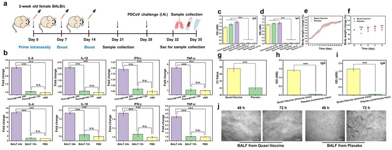 最后,在动物层面验证了AuNR-APT可以快速裂解从鼻腔内吸入的活病毒,有效控制了小鼠的体内炎症(图五)。同时,光热裂解产生的病毒碎片还有效激活了小鼠的体内免疫,对后续的再次攻毒展现出了良好的病毒抑制效果(图六)。