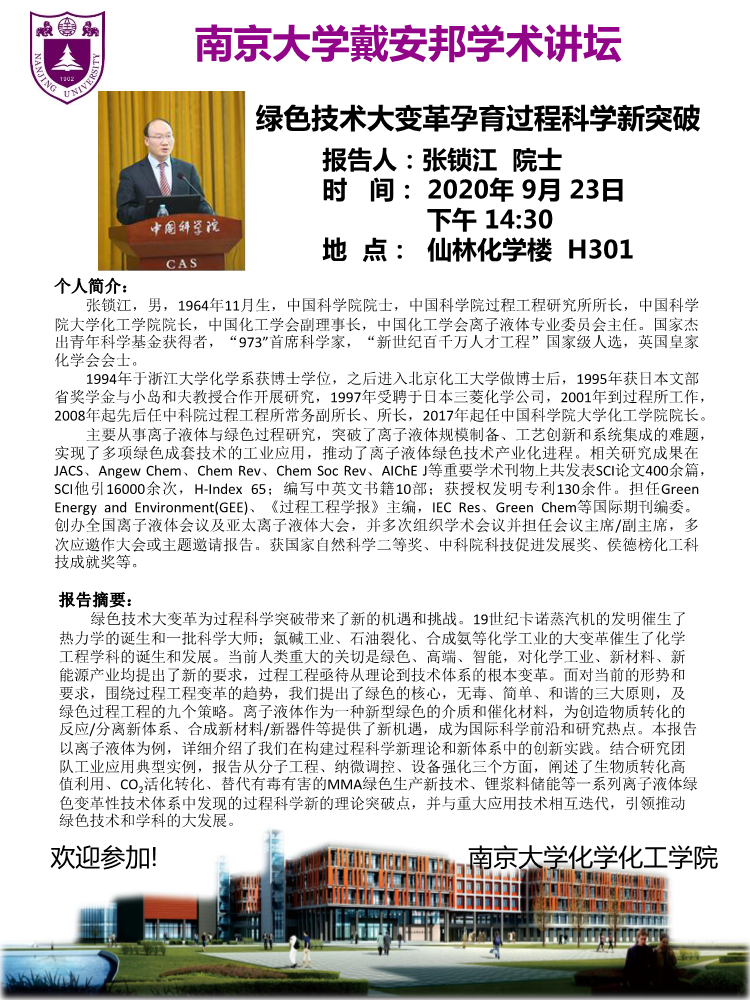 9月23日戴安邦学术讲坛-张锁江院士:绿色技术大变革孕育过程科学新突破