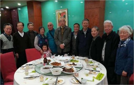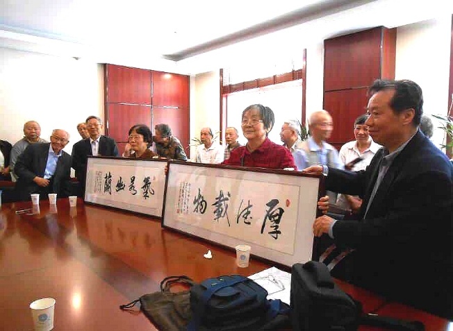 我们给先生敬赠亲笔书写的匾额,“厚德载物”“气若幽兰”,徐福基老師会見了我们並合影留念,我们仿佛又回到了半个世纪前的课堂,在会议厅聆听 老师的教诲;“五十年来你们引以母校为荣,今天母校引你们而骄傲...”。