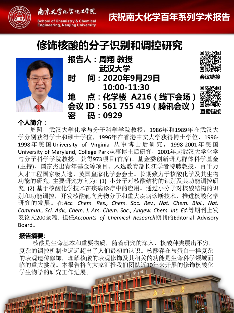 9月29日庆祝南大化学百年系列学术报告-周翔教授:修饰核酸的分子识别和调控研究