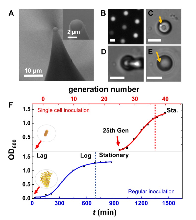 接下来,研究团队将重点放在单细菌孔的选择性操作、培养和高通量分析上(图3)。在确定目标细菌后,研究人员施加负压吸出微孔中含有单菌的液滴,后迅速转移到培养基中进行单细胞培养。团队给出了单细菌接种与常规菌落水平接种的生长曲线对比。常规接种的3.2×107个单菌相当于单个细胞经过25代分裂后的群体规模,将时间尺度转换为世代数进一步分析,生长曲线可以得到很好的对应。