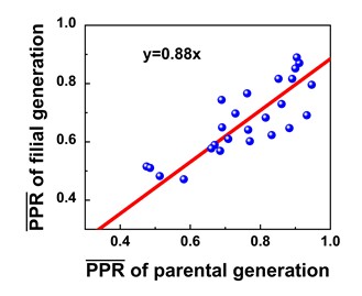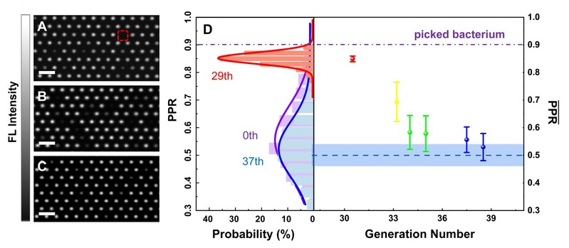随后,团队研究了非凡活性单菌后代的产酸能力随世代数的变化(图4)。首先显示了一个感兴趣的低荧光微孔,其中存在一个高产酸菌(PPR=0.93)。对该菌进行上述选择性操作、培养和高通量分析。第29代子代菌的PPR分布均值为0.89,表明其成功继承了亲代的高代谢活性。然而,一旦培养到更后面的代数,就会显著回归到比亲本低的PPR均值,第37代时,测得的PPR均值约为0.5,与该菌的平均水平相当。此外,单菌培养接近稳定期时,所有具有高于平均PPR的个体细菌的后代均出现了这种回归均值的现象,且活性不再反弹至更高水平。随着繁殖的进行,植物乳杆菌的高于平均水平的质子生产能力将会不可逆地回归到群体的平均水平。
