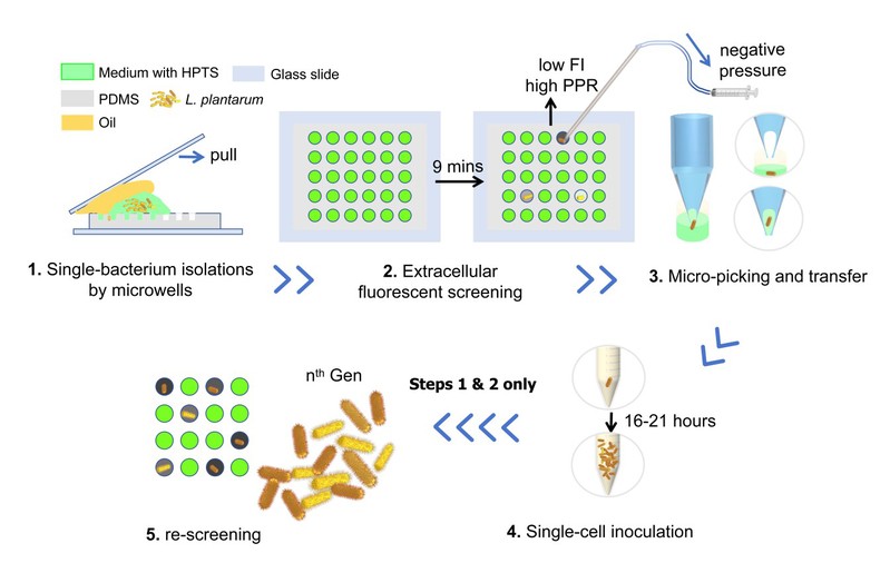 针对这一科学问题,太阳集团tcy8722王伟课题组创新性地开发了一种基于光学显微镜、微孔阵列、胞外pH探针和微移液针的组合来操纵和表征具有不同代谢活性的单个细菌的策略(图1),并首次实现了对高代谢活性细菌及其后代的代谢活性的长期动态追踪。团队以产酸能力突出的植物乳杆菌为模型,发现高活性亲本细菌的后代在30代内仍能维持显著高于群体平均水平,但随着世代延续,这种特殊的高活性会逐渐回归至其平均水平。团队进一步探讨了代谢活性退化的潜在机制,为优化工业菌种稳定性提供了新思路。该成果不仅深化了对微生物表观遗传规律的理解,也为合成生物学中高效细胞工厂的精准设计奠定了方法论基础。相关研究发表于《Proceedings of the National Academy of Sciences of the United States of America》(DOI: 10.1073/pnas.2502818122),论文链接:https://www.pnas.org/doi/10.1073/pnas.2502818122。