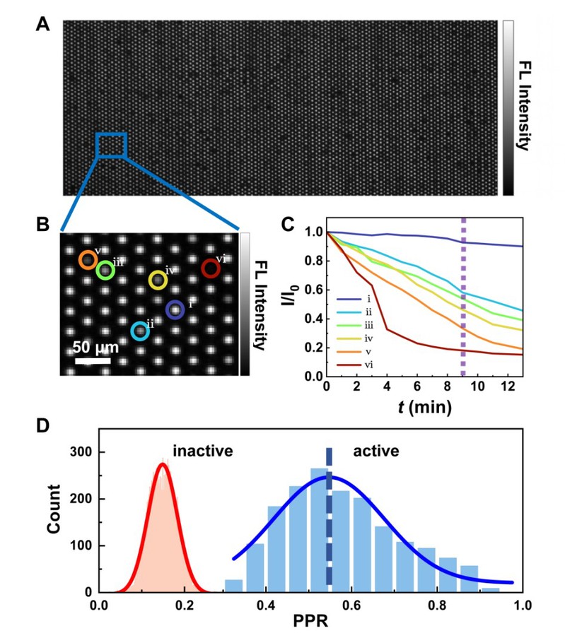 研究团队利用微孔阵列高效分离单菌,并结合HPTS荧光质子探针对视野内约15,000个微孔(1,500个单菌)进行实时监测(图2),以分析单菌的产酸活性。结果显示,活性微孔的荧光强度随时间显著下降,且不同荧光下降趋势表明:单个细菌的代谢活性存在明显异质性——下降越迅速,表明菌体代谢活性越强。