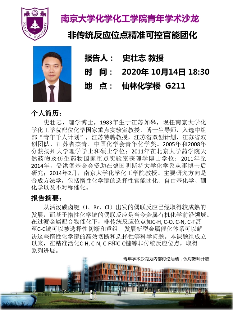 2020年10月14日 | 史壮志 | 非传统反应位点精准可控官能团化 | 18:30 | G211 |