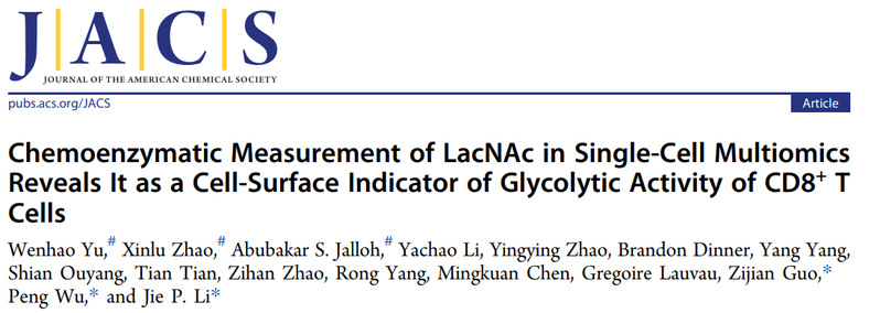 近日,太阳集团tcy8722李劼团队、郭子建团队与美国Scripps研究所吴鹏团队合作在J. Am. Chem. Soc.杂志发表了题为“Chemoenzymatic Measurement of LacNAc in Single-Cell Multiomics Reveals It as a Cell-Surface Indicator of Glycolytic Activity of CD8+ T Cells”的研究论文。该研究利用岩藻糖基转移酶的化学酶法标记策略,构建了一种分析细胞表面N-乙酰乳糖胺(LacNAc)聚糖单元动态变化的单细胞多组学方法,并发现了LacNAc水平与CD8+ T细胞激活状态密切相关。进一步分析显示CD8+ T细胞表面的LacNAc含量反映了CD8+ T细胞的糖酵解活性。团队验证了该方法与多种单细胞多模态组学平台兼容,可同时获得单细胞转录组、单细胞表面蛋白组、单细胞免疫组库以及细胞表面LacNAc等信息,为表征细胞表面聚糖在不同生理状态下的生物学作用提供了新的途径,同时也证明了利用化员工物学方法拓展单细胞多组学平台的可实现性。