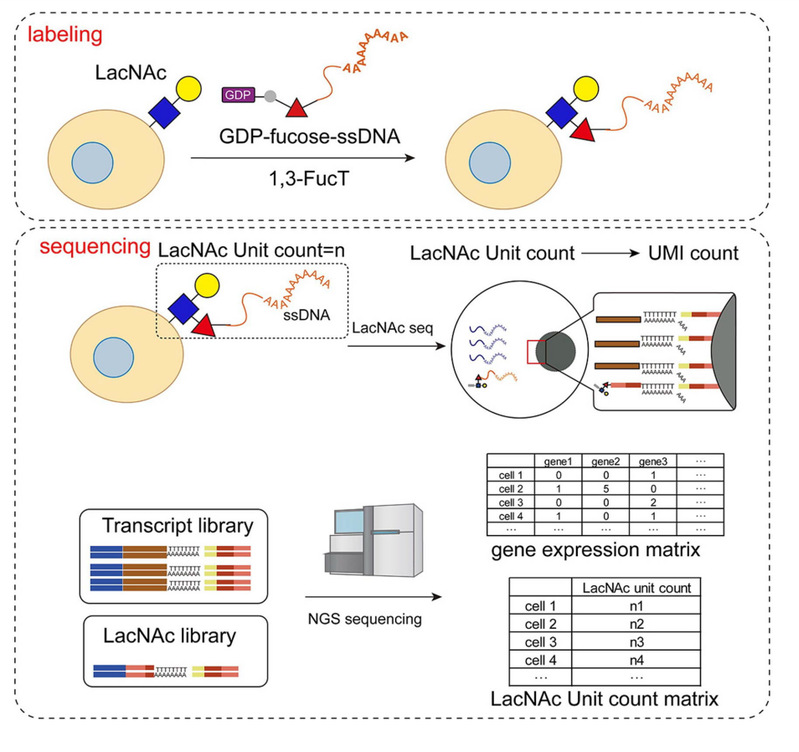本研究中,作者构建了基于化学酶法的单细胞多组学测序技术。利用重组幽门螺杆菌α1,3岩藻糖基转移酶(FucT)将带有单链DNA(ssDNA)标记的岩藻糖残基转移到LacNAc聚糖单元的N-乙酰葡糖胺(GlcNAc)的3-OH,实现了特异性聚糖信息向DNA信息的转化。通过设计ssDNA的序列将细胞表面LacNAc检测与单细胞多组学平台整合,同时获得单细胞转录组信息和LacNAc信息,并将该技术命名为LacNAc-seq。作者将LacNAc-seq应用于混合细胞系和原代免疫细胞检测,验证了LacNAc-seq同时检测细胞表面LacNAc和单细胞转录组的可行性,并证明该方法对免疫细胞的转录组无明显扰动。