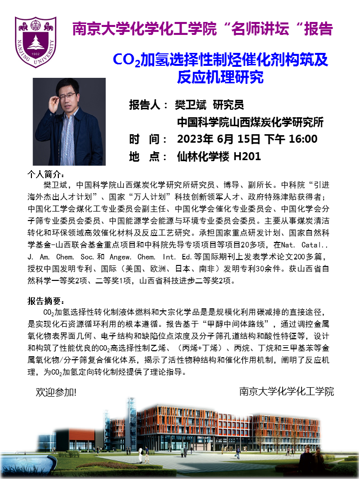 6月15日名师讲坛-樊卫斌研究员:CO2加氢选择性制烃催化剂构筑及反应机理研究
