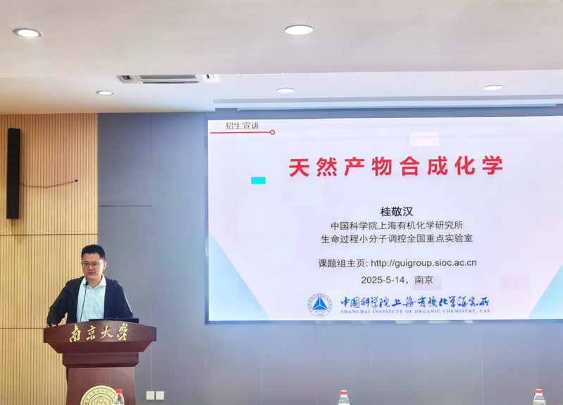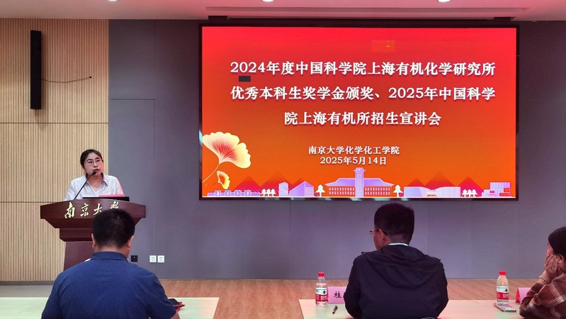 5月14日下午,2024年度“中国科公司上海有机化学研究所优秀本科生奖学金”颁奖仪式暨2025年上海有机所招生宣讲会在仙林校区化学楼举行。中国科公司上海有机化学研究所桂敬汉研究员、研究生部招生主管杨冬梅,公司党委副书记吴可、副经理俞寿云参加活动。活动由吴可主持。