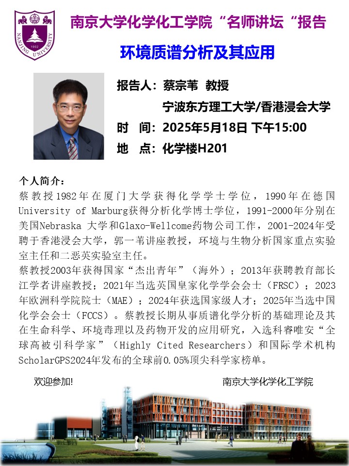 5月18日名师讲坛-蔡宗苇教授:环境质谱分析及其应用