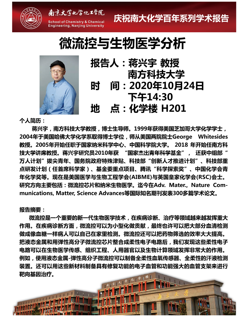 10月24日庆祝南大化学百年系列学术报告-蒋兴宇教授:微流控与生物医学分析