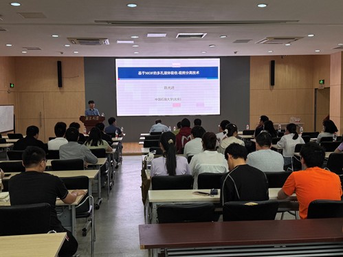 陈光进教授报告了基于MOF的多孔液体吸收-吸附分离技术,开发了新型的具有高分离性能、大吸附容量、高选择性、高吸附速率的多孔浆液,并介绍了浆液法应用于气体分离工业应用的新工艺路线。报告结束后,揭克诚研究员针对报告内容与陈光进教授展开了激烈的学术探讨。
