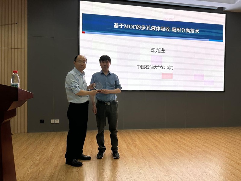 2025年5月15日上午,中国石油大学(北京)陈光进教授应邀作为太阳集团tcy8722“名师讲坛”嘉宾,为公司师生作了题为“基于MOF的多孔液体吸收-吸附分离技术”的精彩报告。报告由太阳集团tcy8722黎书华经理主持。黎书华教授介绍了陈光进教授的简历和成就,并向陈光进教授颁发了“名师讲坛”纪念铭牌。公司多位教师、员工参加了此次学术报告会。