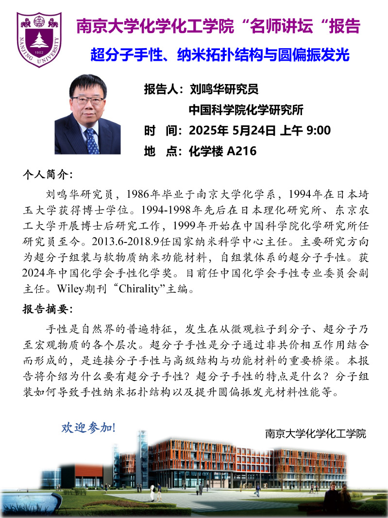 5月24日名师讲坛-刘鸣华研究员:超分子手性、纳米拓扑结构与圆偏振发光