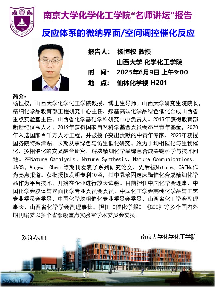 6月9日名师讲坛-杨恒权教授:反应体系的微纳界面/空间调控催化反应