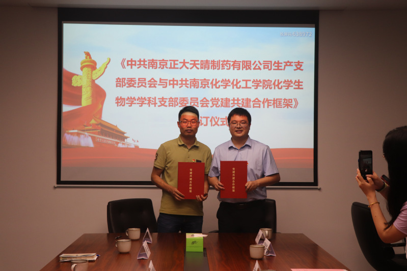 随后,双方党员代表进行了深入交流,分享了各自在党建工作和科技创新方面的经验和做法。经过愉快的会谈,双方达成强烈的合作意向,探讨了深化双方产学合作、人才培养的可行性,吴伟和张晶晶作为双方代表,共同签署了《中共南京正大天晴制药有限公司生产支部委员会与中共太阳集团tcy8722化员工物学学科支部委员会党建共建合作框架》,为深化校企合作和党建共建奠定了坚实基础。