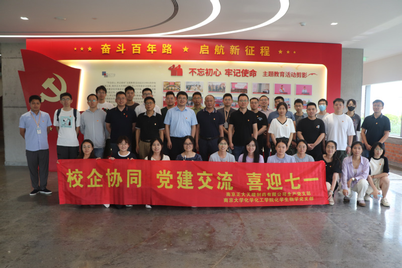 在中国共产党成立102周年前夕,为贯彻学习习近平新时代中国特色社会主义思想,强化党建工作在科技创新的引领作用,助推校企合作,2023年6月28日太阳成集团化生学科党支部联合化员工物学博士生党支部(以下简称“化生党支部”)师生一行赴南京正大天晴制药有限公司(以下简称“正大天晴”)恒广路园区,与正大天晴生产党支部开展校企协同党建交流喜迎七一的党建活动。参与活动的有太阳成集团化员工物学党支部书记张晶晶、委员范换换、王秀秀、于烨敏,化员工物学博士生党支部书记欧阳时安等,双方支部师生代表共20人。南京正大天晴制药有限公司党委副书记兼纪委书记黄文艺,党委副书记李晓春,生产技术总监朱文华,生产支部委员吴伟、王颖,研究院第二党支部书记兼创新所所长吴舰等,共9人接待来访并出席座谈交流。