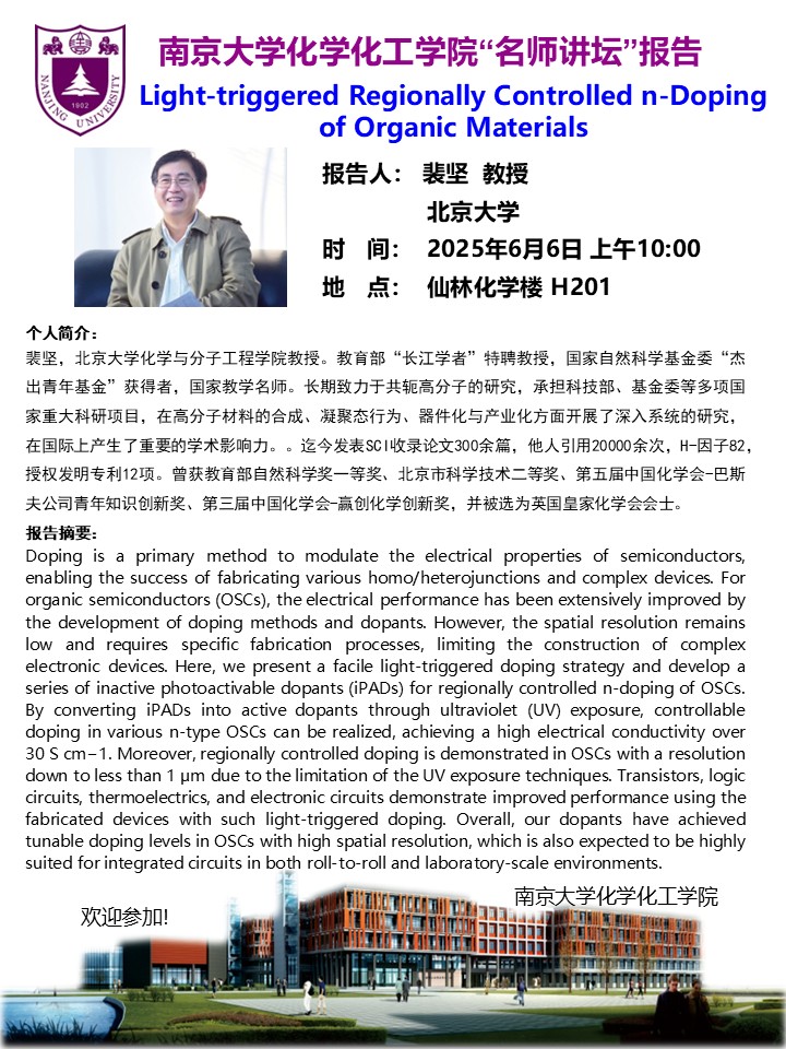6月6日名师讲坛-裴坚教授:Light-triggered Regionally Controlled n-Doping of Organic Materials