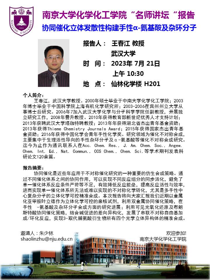 7月21日名师讲坛-王春江教授:协同催化立体发散性构建手性α-氨基酸及杂环分子