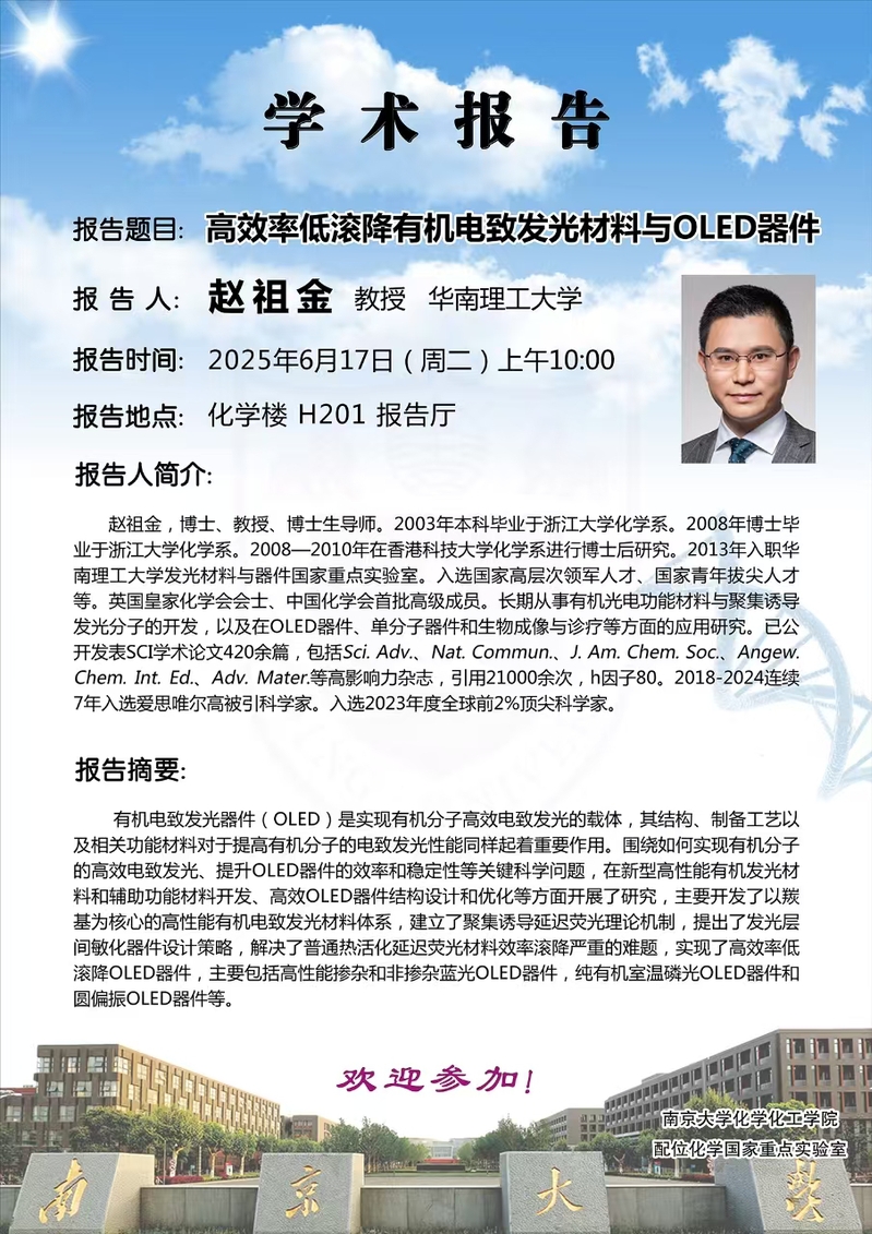 6月17日学术报告-赵祖金教授:高效率低滚降有机电致发光材料与OLED器件