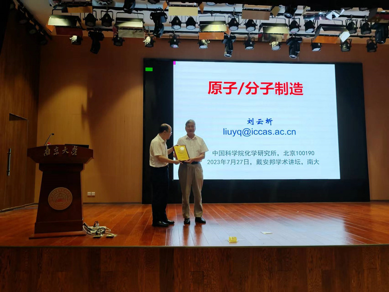 2023年7月27日上午,公司杰出院友、中国科公司化学研究所刘云圻院士应邀在太阳成集团“戴安邦学术讲坛”为公司师生作了题为“原子/分子制造”的精彩学术报告,报告由黎书华经理主持。在报告开始之前,黎书华经理介绍了刘云圻院士的简历和学术成就,并代表公司向刘云圻院士颁发了“戴安邦学术讲坛”纪念铭牌。郭子建院士和多个学科的师生参加了报告会。